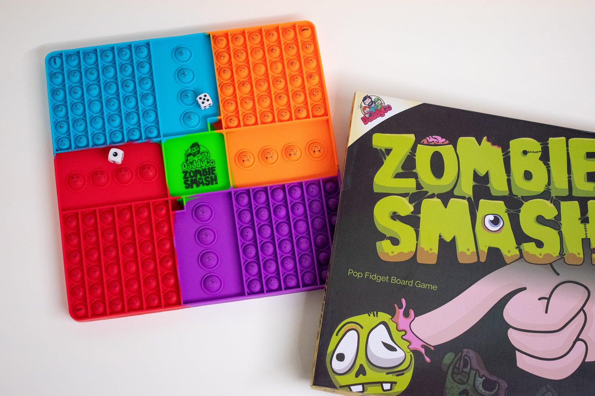 Zombie Smash is an easy-to-pick-up and play any time dice rolling game with a unique fidget game board that helps young hands work on their fine motor, sensory, and counting skills!